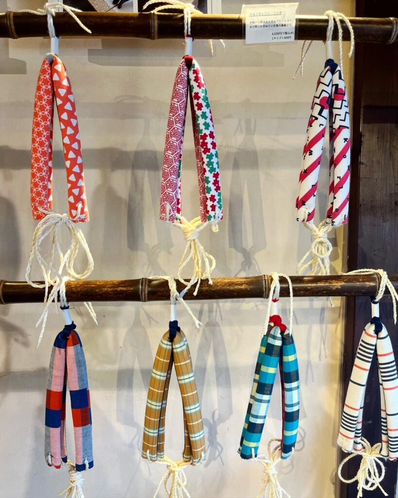 鼻緒は郡上の地場産業シルクスクリーンプリントのポップで可愛いものや藍染の落ち着いたものなどラインナップがたくさんあります。