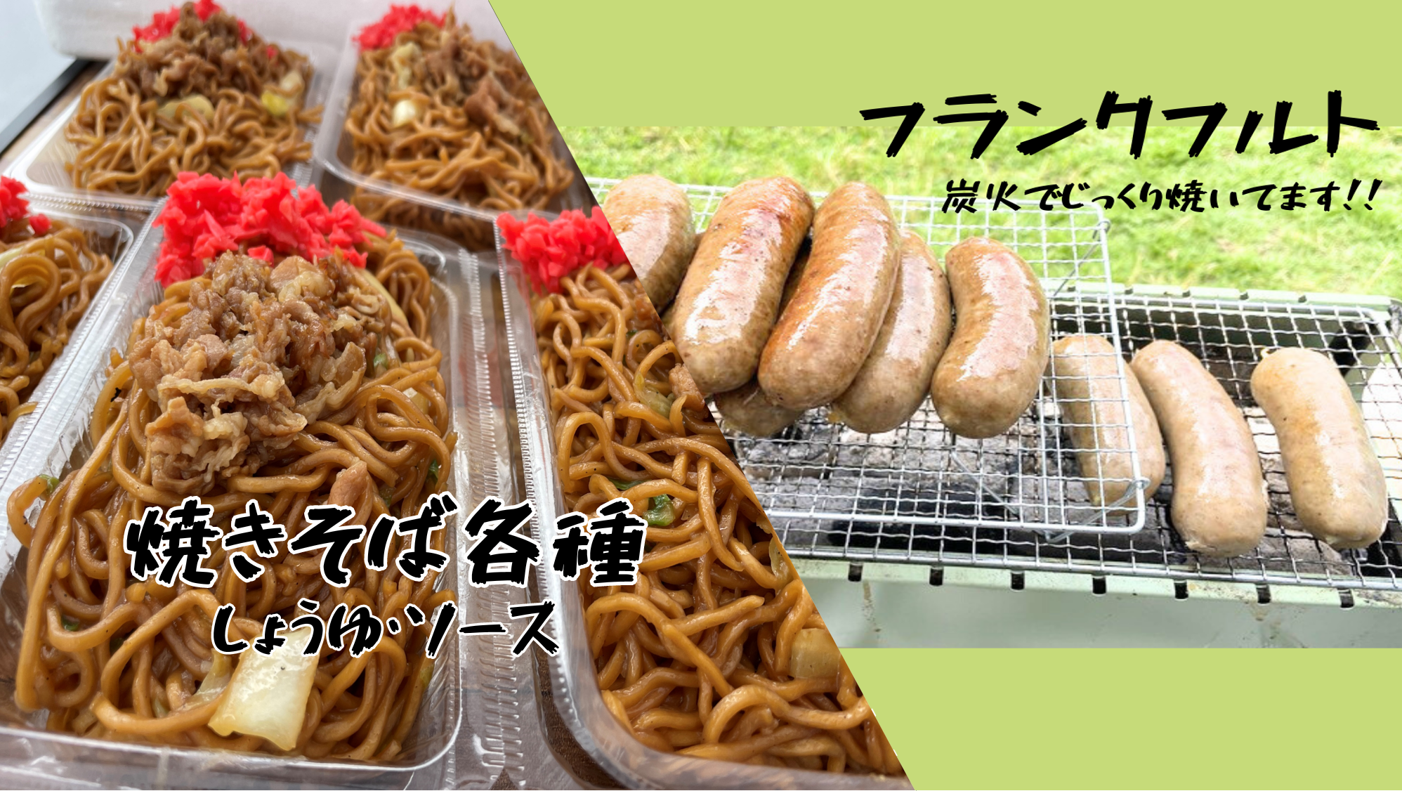 定番のソース焼きそば、甘辛く煮込んだしょうゆベースの煮汁で味付けのしょうゆ焼きそば 炭火でじっくり焼き上げたフランクフルトを提供します。 一風変わった味付けの焼きそばと炭火ならではの香ばしいフランクフルトを是非ご賞味ください。