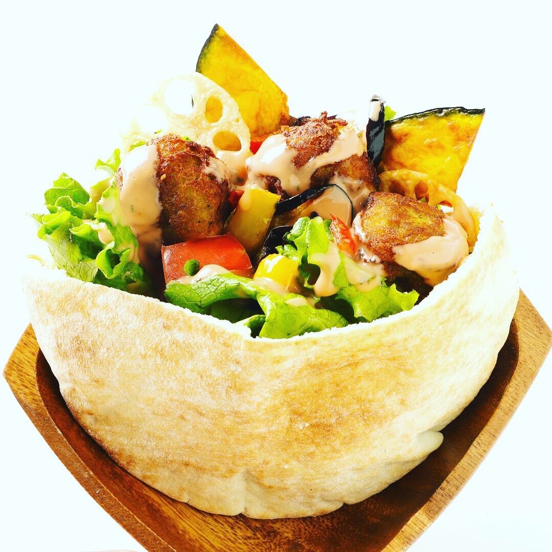 ひよこ豆のコロッケをピタパンにサンドしたファラフェルピタサンド、塩麹とスパイスでマリネしたチキンを使ったチキンピタサンド等、是非お試しください!