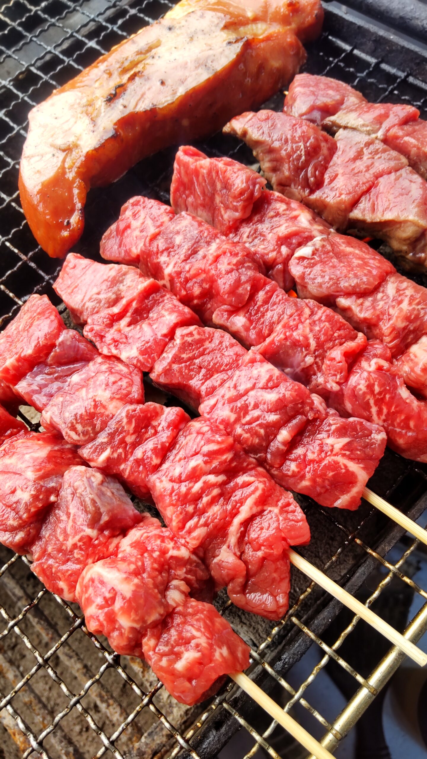 郡上八幡の肉屋店主が厳選した飛騨牛を炭火串焼きで提供の他に岐阜県ブランドポークボーノポークのフランクフルト等