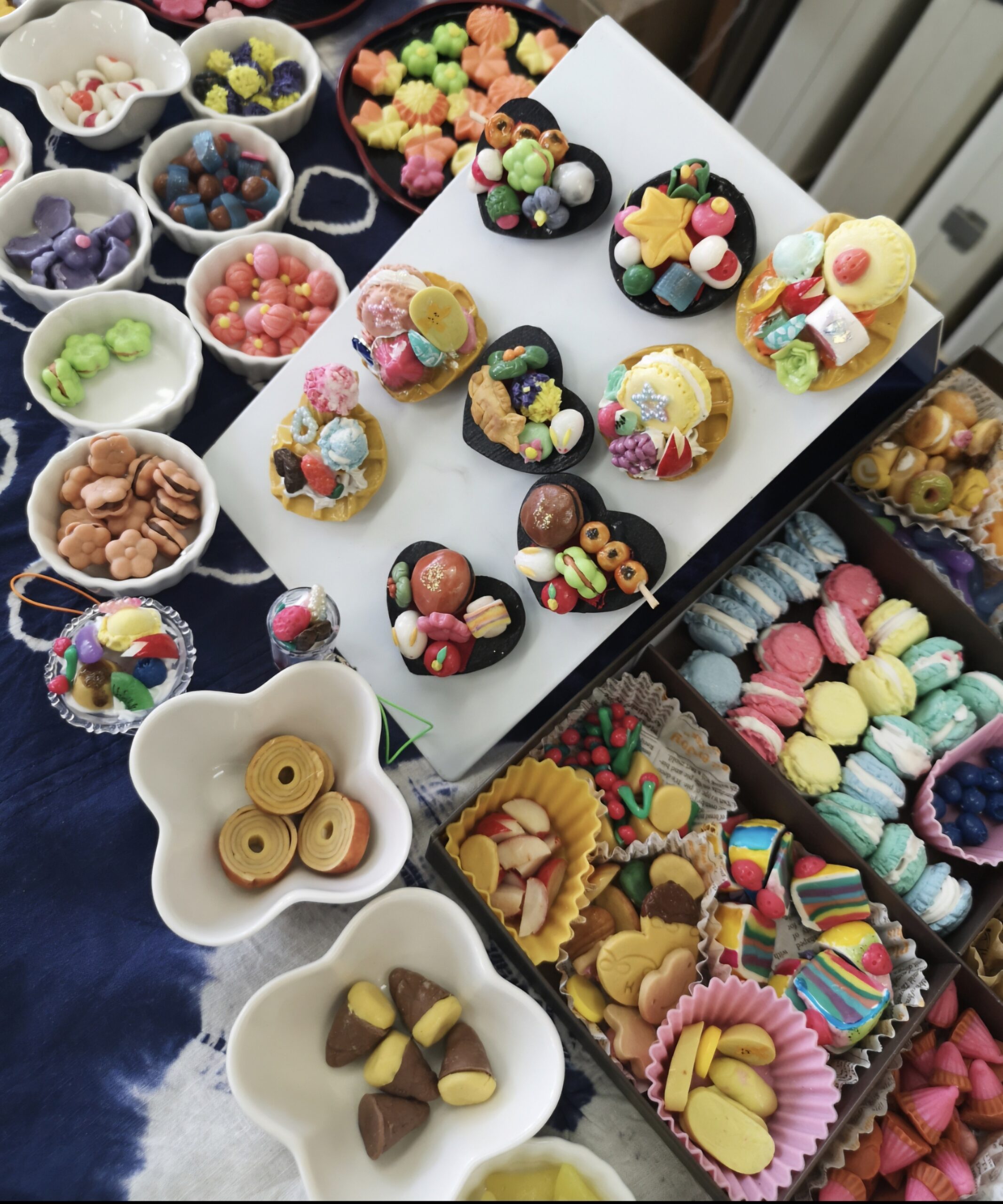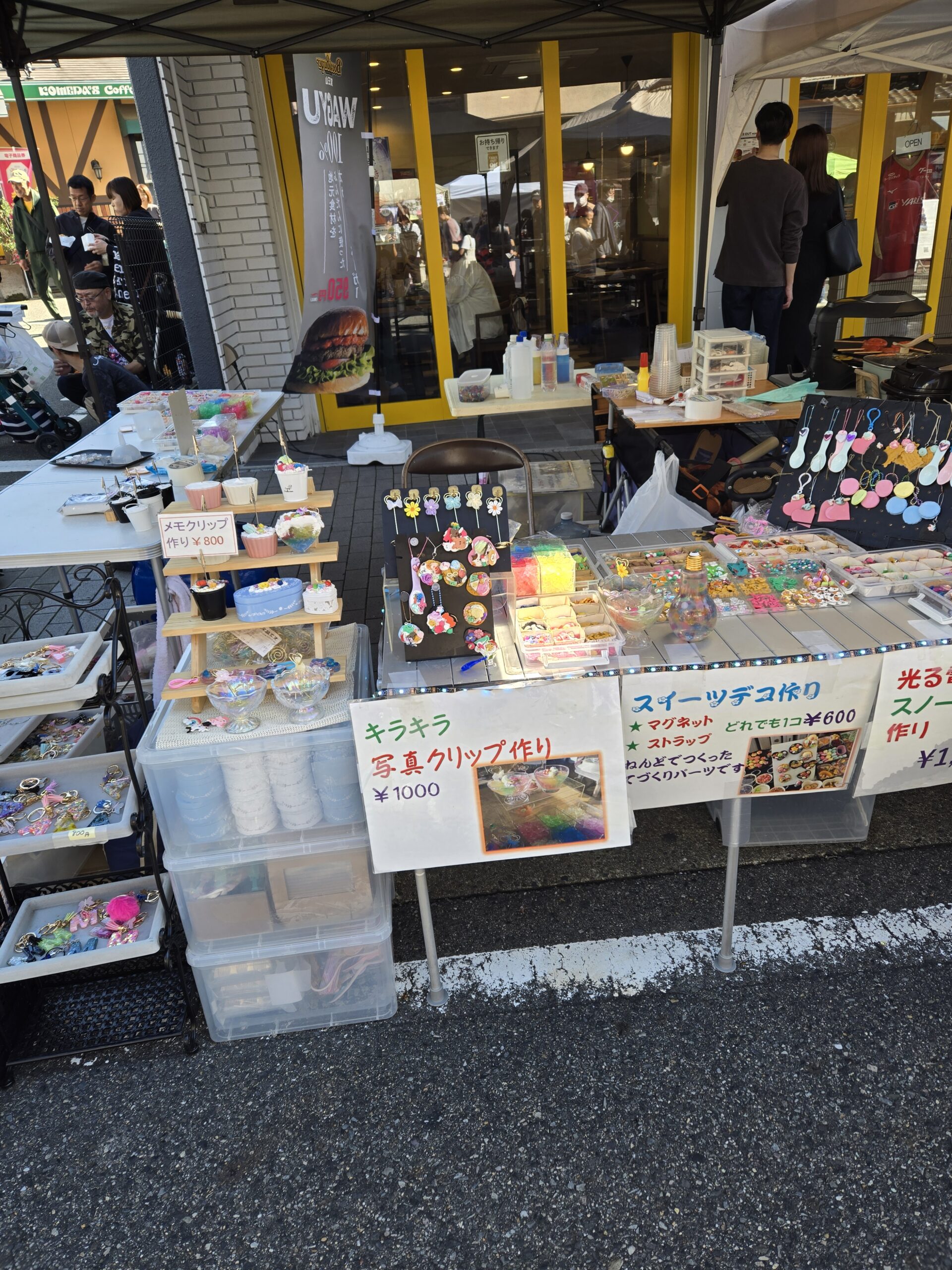 ハンドメイド粘土パーツからお好きな物を選んでデコスイーツを作るワークショップです。他にもキラキラ写真クリップ作り、光る電球スノーボール作りもあります。