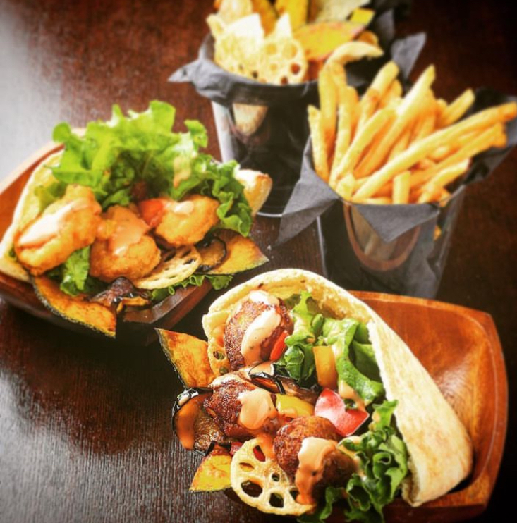 ひよこ豆のコロッケ「ファラフェル」を旬の野菜とピタサンドにしました。海外ではスタンダードなストリートフード&動物性の食材を使用しないヴィーガンフードです。チキンサンド、フライドポテト等もご用意しております!